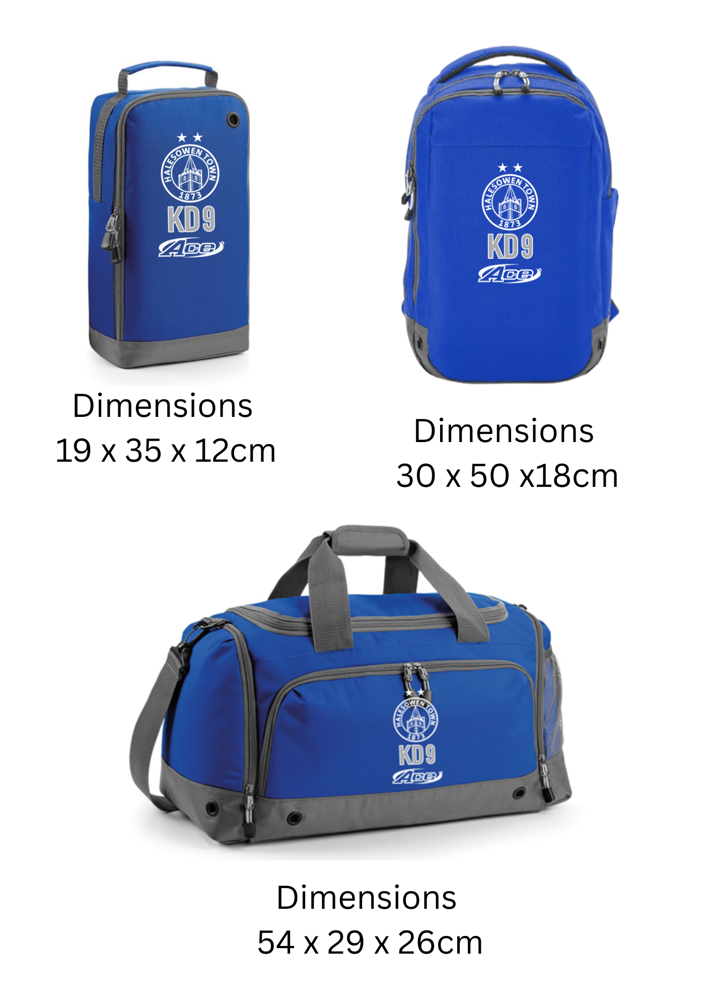 Multi feature sports holdall bag, printed club logo and players initial and number